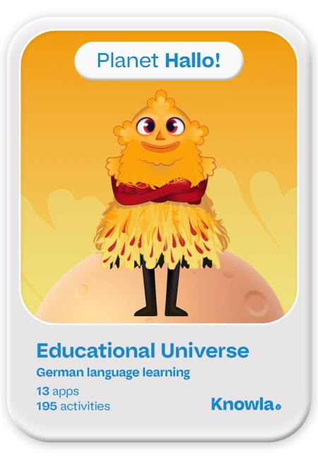 Planeta Hallo! (zestaw aplikacji edukacyjnych) zanurza dzieci w języku niemieckim, pomagając im uczyć się w naturalny i przyjemny sposób. Aplikacje w formie zabawy oswajają dzieci z językiem obcym i doskonalą znajomość podstawowego słownictwa. Dodatkowo interaktywne aktywności pozwalają ćwiczyć budowę zdań, zapisu wyrazów czy alfabet.