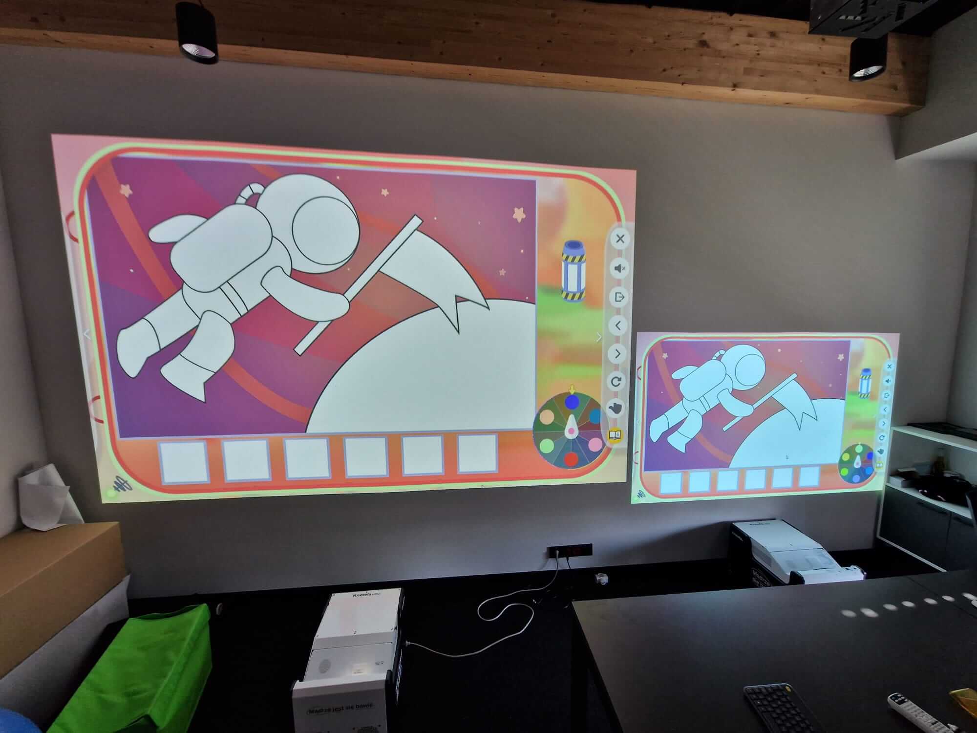 Jeśli odpowiedziałeś tak na choć jedno z tych pytań, to wypróbuj nowe udogodnienie na Knowla Box. Urządzenie już nie musi stać bezpośrednio przy ścianie, żeby móc cieszyć się pełnią swoich interakcji. Z piłeczek czy pisaków można korzystać na większej przekątnej wciąż ostrego obrazu. Jest to idealne rozwiązanie do wykorzystania Knowla Box na różnorodnych imprezach czy uroczystościach.